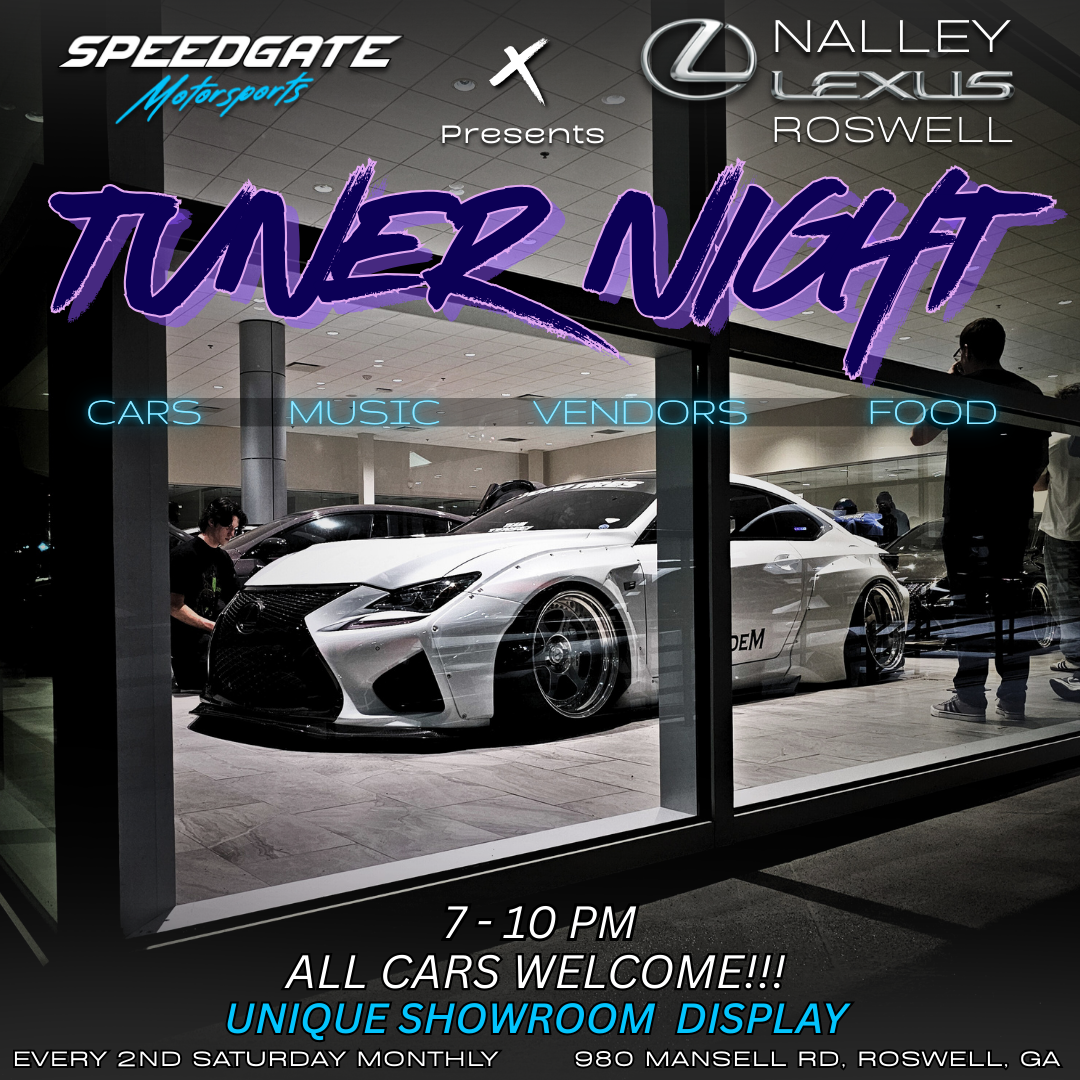 Tuner Night is a unique automotive experience created by SpeedGate Motorsports and hosted at Nalley Lexus of Roswell. This event is highly unique in that owners of show car builds, exotic supercars, and many other clean rides are allowed inside a luxurious dealership showroom and put into the spotlight for social media, photographers, and videographers alike.